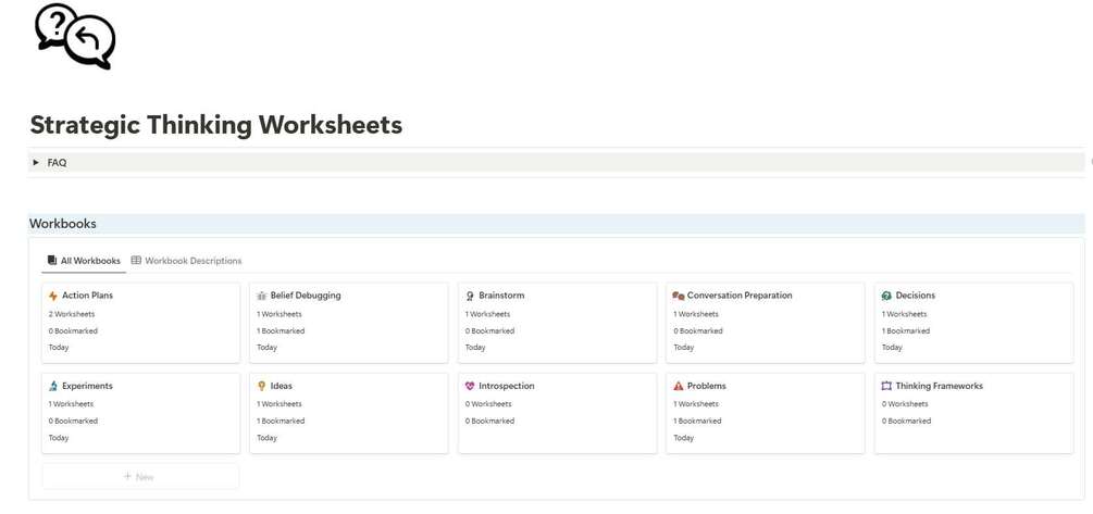 The template includes 9 Workbooks with templatized worksheets designed to guide you through deeper thinking for decision-making, idea development, and more. It also features 5 thinking frameworks that can be applied to any worksheet to facilitate deeper analysis. Additionally, it includes an action/task list to consolidate action items from each worksheet, allowing you to view them all in one place.